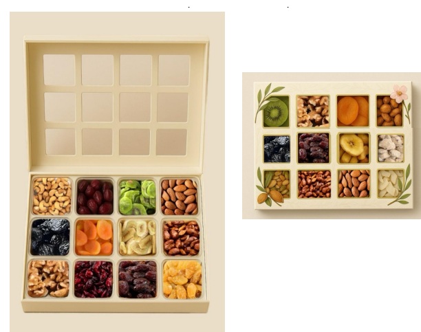 המארז כולל 12 קופסאות פירות יבשים במשקל כולל של כ־1.3 ק״ג, כשהקופסאות מסודרות בצורה מרשימה שמדגישה את צבעוניות הפירות.